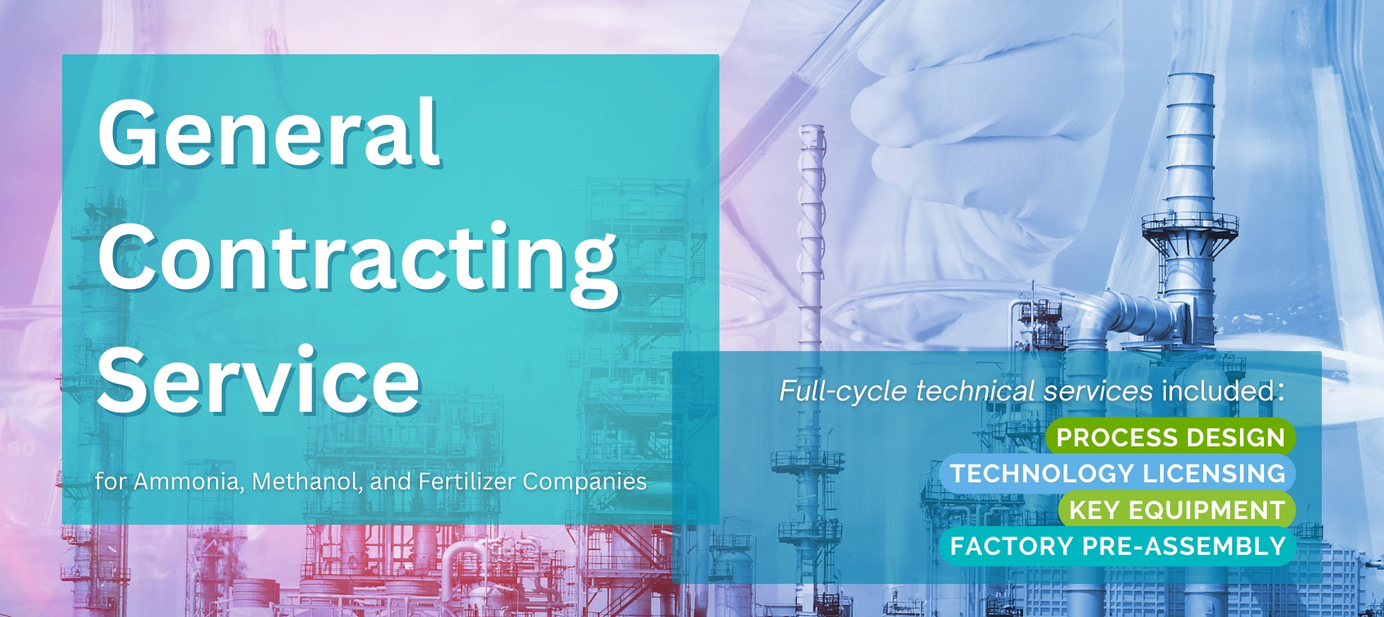 We offer engineering design, procurement, construction, and project management subcontracting of chemical engineering projects, aiming to provide owners and general contractors with a one-stop service for technology, construction, products, and operations and maintenance.